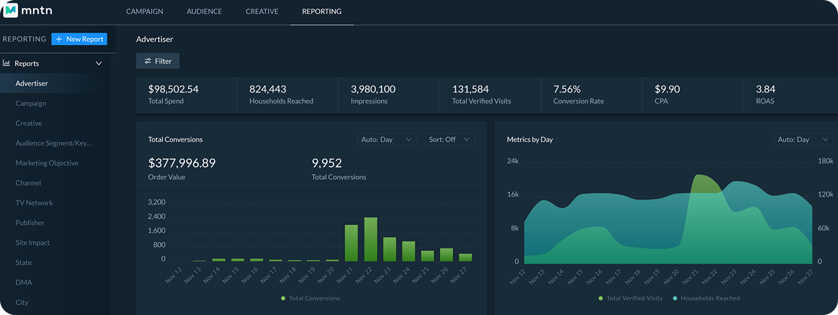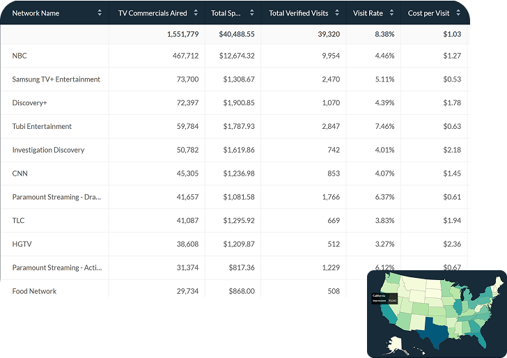 Reporting: Near-real-time metrics on verified site visits, conversions, revenue, CPA, and cost per visit. Easy to view reports that can be broken down by network/publisher, audience, geography, and creative, giving actionable insight. Optional lift/incrementality tests isolate the impact attributable to CTV.